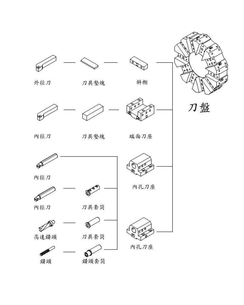 - 伺服式刀塔:刀盤使用伺服馬達驅動定位,再藉由油壓鎖固,換刀速度快且定位精準,減少維修問題之發生
